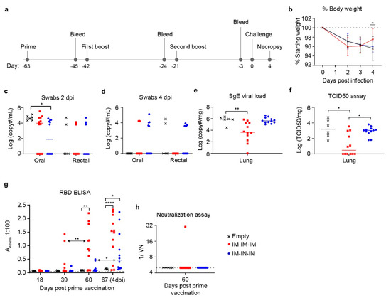 Due to the low immunogenicity of our prime-boost regimen, we next evaluated whether an additional boost would improve immune responses to the vaccine. Prime-boost-boost hamsters were divided into two spike-vaccinated groups and one control group. We elected to perform a prime-boost-boost vaccine regimen solely with DNA complexed to the in vivo delivery reagent as the complexed vaccine showed the greatest trend towards reduced viral titers in the swabs and lung tissue (Figure 2c–f). Spike-vaccinated hamsters received 50 µg of Sp_pVax1 complexed to in vivo delivery reagent in either an IM-prime IM-IM-boosts (IM-only) or an IM-prime IN-IN-boosts (IM/IN combination) schedule with each vaccination separated by 3 weeks (Figure 3a). We evaluated both IM-only and combined IM/IN vaccinations as we hypothesized that IM-priming followed by IN-boosting would elicit greater protective immunity at the site of SARS-CoV-2 exposure (nasal mucosa) and replication (lungs). Control group hamsters (Empty) received either of the two vaccination schedules with 50 µg empty pVax1 complexed to in vivo delivery reagent and were pooled for analyses. Hamsters were challenged three weeks post second boost with 1000 TCID50 SARS-CoV-2 and necropsied on 4 dpi as before (Figure 3a). Similar to the prime-boost hamsters, all groups initially lost weight after infection however, by 4 dpi, the IM-only group had slightly but significantly increased weight compared to controls (Figure 3b). Again, weight loss in any group was minimal. At 2 dpi, oral shedding of virus was slightly but significantly reduced in the IM/IN combination group compared to controls (Figure 3c). However, by 4 dpi, the swabs no longer showed significant differences between vaccination routes as most hamster’s viral loads dropped below the SgE PCR limit of detection (Figure 3d). In respect to lung viral loads at 4 dpi, hamsters receiving IM-only vaccination had significantly reduced viral loads by both SgE qRT-PCR (~2 log decrease, p = 0.0061) and infectious virus TCID50 (~3 log decrease, p = 0.0326) compared to the control group (Figure 3e,f). Notably, half of the hamsters in the IM-only group had no detectable infectious virus whereas all hamsters in the control and IM/IN group had detectable infectious virus (Figure 3f).