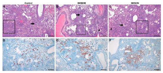 Histopathology and Immunohistochemistry of Control and Vaccinated Prime-Boost-Boost Hamster Lungs. Histopathology of control and vaccinated hamsters (A–C) are similar and characterized foci of moderate to severe interstitial pneumonia and disruption of loss of pulmonary architecture (boxes), regions of alveolar cellular exudate (arrows) and occasional foci of pulmonary edema (arrowhead; (B,C)) are indicated. Immunohistochemistry of control and vaccinated hamsters is similar (D–F) with abundant SARS-CoV-2 immunoreactivity observed in type I and II pneumocytes and macrophages. Representative images for each group are shown. (Bar = 200 μm).