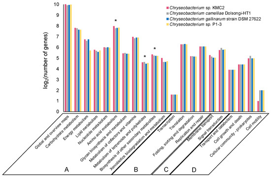 Comparison of KEGG function classification amongst four Chryseobacterium genomes. Functional categories: Metabolism (A), Genetic information processing (B), Environmental information processing (C), and Cellular processes (D). The stars show the sub-categories: Amino acid metabolism, metabolism of terpenoids and polyketides, and biosynthesis of other secondary metabolites.