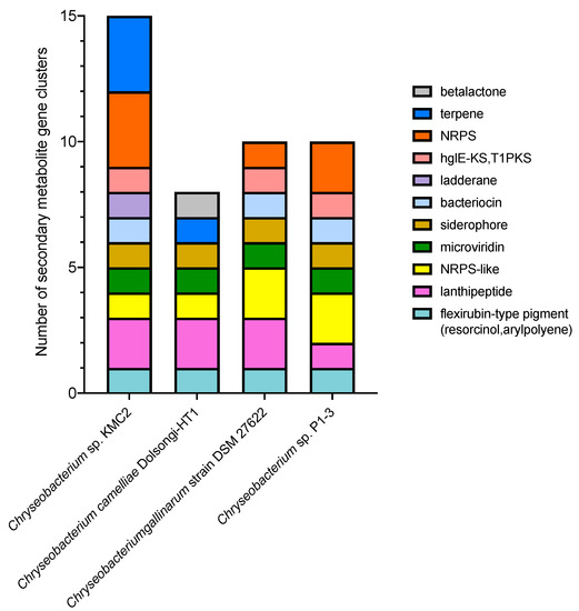 Genome mining is an effective approach to discover new bioactive natural products from microorganisms based on “signature genes” detection or searching for specific patterns in gene sequences [54]. To explore the potential of producing high value chemicals from these four Chryseobacterium, secondary metabolite gene clusters were predicted by using antiSMASH 5.0 mining pipeline (Figure 3). In total, eleven different secondary metabolite gene clusters were identified. Chryseobacterium sp. KMC2 possesses the largest number (15), while Chryseobacterium camelliae Dolsongi-HT1 has the fewest (8). Ten gene clusters were predicted from the other two strains. Five gene clusters are present in the four genomes, which are flexirubin-type pigment (resorcinol and arylpolyene), microviridin, lanthipeptide, NRPS-like, and siderophore. Remarkably, the flexirubin-type pigment is a typical metabolite produced from Flavobacterium [55]. Several species from Chryseobacterium were previously designated and known as Flavobacterium owing to similar characteristics with the yellow pigments [56]. Flexirubin-type pigment was isolated and characterized from Chryseobacterium sp. UTM-3T [57]. In addition, Chryseobacterium sp. KMC2 owns a unique gene cluster to produce ladderane. Another unique natural product is beta-lactone from Chryseobacterium camelliae Dolsongi-HT1. Ladderanes are hydrocarbon chains which were regarded as membrane lipid components produced by anammox (anaerobic ammonia-oxidizing) bacteria uniquely, but the production is not affordable due to their extremely low growth [58,59]. Secondary metabolite gene clusters of other eight Chryseobacterium genomes were also predicted, consisting of 14 different candidates (Supplementary Figure S2). These results demonstrate that various secondary metabolite gene clusters including both expected and unusual were discovered from Chryseobacterium genomes, which could turn into novel bioactive natural product sources.