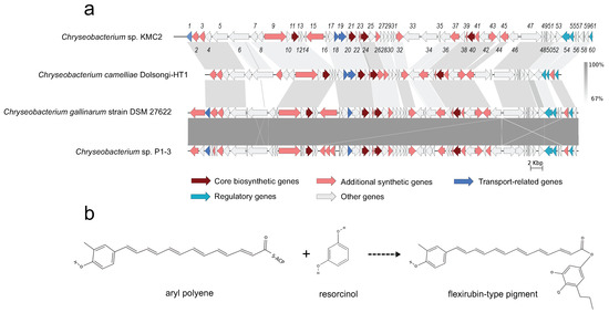 Natural pigments have increasing applications in food, pharmaceutical, and textile industries, owing to their advantages such as non-toxic, biodegradable, and low allergenic potential compared to synthetic pigments [61]. In particular, flexirubin-type pigment has a potential antimicrobial and anti-tumoral activities [62]. Biosynthesis gene clusters of flexirubin-type pigment are conserved across the four tested genomes, especially within Chryseobacterium gallinarum strain DSM 27622 and Chryseobacterium sp. P1-3 (Figure 4a). A total of 61 biosynthesis-related genes of flexirubin-type pigment were predicted from Chryseobacterium sp. KMC2, including four core biosynthesis genes. One of the core biosynthesis genes was annotated as 3-oxoacyl-(acyl carrier protein) synthase III (Flex11), and the other three were annotated as Beta-ketoacyl synthases (Flex21, Flex24, and Flex40). Besides, transport-related genes and regulatory genes were predicted from the gene cluster. A previous study identified the molecular structure of flexirubin-type pigment isolated from Chryseobacterium sp. UTM-3T [57]. According to the products from core biosynthesis genes and their molecular structures, a proposition of biosynthesis pathway was established (Figure 4b), where flexirubin-type pigment is generated from resorcinol and arylpolyene. Further transcriptomics and metabolomics analysis would be required to confirm the validity of this potential pathway discovery.