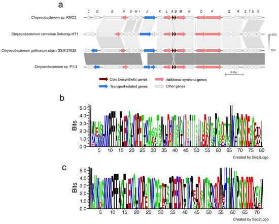 Assembled contigs of four Chryseobacterium species were uploaded to antiSMASH 5.0 secondary metabolite genome mining web platform [21]. Predicted secondary metabolites gene clusters from Chryseobacterium sp. KMC2 were compared with other keratinolytic Chryseobacterium species. Gene annotation of each cluster from Chryseobacterium sp. KMC2 was performed by Prokka v1.14.5 [30] and BLASTP with the NCBI database. The best match sequencing ID was recorded for the annotated genes. Synteny and features of conservative secondary metabolite gene clusters were analyzed by using Easyfig 2.2.2, showing the similarity of gene sequences [39]. Feature comparison of amino acid sequences and motifs from core synthetic genes were analyzed by using Clustal Omega [40] to get the multiple sequence alignment and using Seq2logo to generate sequence logo [41].