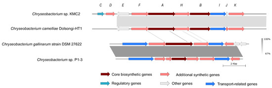 Comparative genomics can reveal unique cluster and distribution patterns of secondary metabolites within species [60]. Five secondary metabolite gene clusters, predicted to be present in the four genomes, were selected to explore the homology among these Chryseobacterium strains. Three of them including flexirubin-type pigment, microviridin, and siderophore display a conserved gene cluster structure from synteny analysis (Figure 4, Figure 5 and Figure 6), while the other two showed no evident synteny relation (Supplementary Figures S3 and S4).