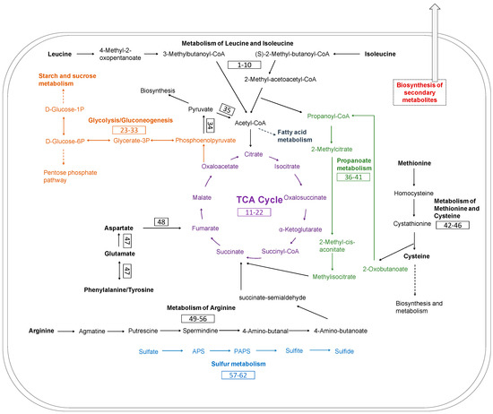 Metabolic pathways reconstruction of keratin utilization in Chryseobacterium sp. KMC2 genome. It includes amino acid metabolism, TCA cycle, glycolysis/gluconeogenesis propanoate metabolism, and sulfur metabolism. The number in the box represents the gene related to the metabolic pathway. The detailed description of each gene can be found in Table S7.
