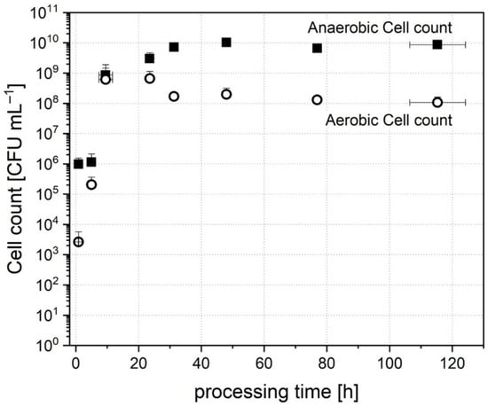 The inoculum cell count level was 3 ± 0.7 × 106 CFU mL−1 anaerobes and 3 ± 3 × 104 CFU mL−1 facultative aerobes. After addition to the bioreactor and dilution with the medium, the cultivation cell broth contained a starting cell count level of 1 ± 0.6 × 106 CFU mL−1 anaerobes and 3 ± 3 × 103 CFU mL−1 facultative aerobes. Figure 2 shows the evolution of cell count over a processing time of 120 h.