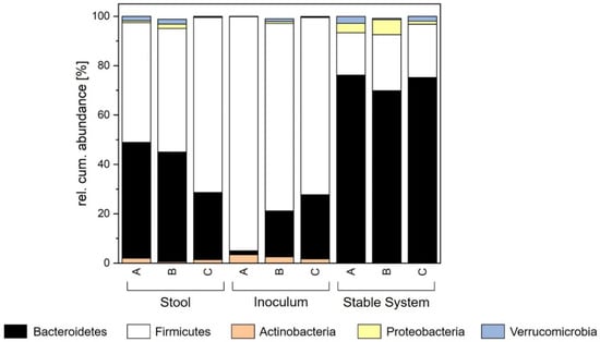 When cultivating the microbiota in vitro, a high similarity with the original stool is the aim. For donor A, the cell count in the cultivated stable system differed: it increased significantly to 1 ± 0.6 × 108 (facultative aerobe) and 0.9 ± 0.2 × 1010 CFU mL−1 (anaerobe). Regarding the metabolic profile, an increase was also observed. The amount of SCFAs in the broth was significantly higher with a value of 8.29 ± 0.55 mg mL−1 compared to the donor stool (6.80 ± 0.47 mg mL−1). These increases in cell count and metabolites are probably linked since more cells produce more metabolites. Regarding the composition of these cells, the abundance of Proteobacteria and Verrucomicrobia showed no significant difference between stool and cultivated broth. On the other hand, the phyla Actinobacteria, Bacteroidetes and Firmicutes differed significantly based on a p-value of 0.05 from the original sample. As can be seen in Figure 4, the abundance of Actinobacteria in stool was 2.02%, whereas it was lower in the cultivated system (0.09 ± 0.06%). Furthermore, the abundance of Firmicutes was decreased from the original value of 48.52% in the stool to an abundance of 17.13 ± 2.12% in the stable system. In contrast, the abundance of Bacteroidetes increased during cultivation from 46.89% (stool) to 76.10 ± 1.96% in the stable system. For donor B and C, the composition of the in vitro microbiota was similar and comparable to donor A. All three artificial systems showed significant increases in cell count and SCFAs with slight differences in the extent of increase. The microbial composition in the stable systems was defined by an increase in Bacteroidetes and Proteobacteria and a decrease in Firmicutes and Actinobacteria. Differences can only be observed for the phylum of Verrucomicrobia. For donors A and C, an increase in abundance was detected in the stable system. However, these observations represent only a trend but no significant differences. The microbial diversity in the cultivated system of donor A showed a significantly lower value (16.99 ± 1.01) than in the stool (21.42). However, the richness in the system was not affected. Here, the richness of 107 ± 3.94 in the stable state was comparable to that in the donor stool (100). The behavior of the cultivations of donors B and C was similar. Consequently, the established system is more influenced by the system parameters themselves. The behavior of the three donor stools during cultivation was comparable and similar. Nevertheless, individual donor characteristics remained.