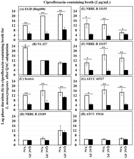 Changes in the lag phase duration (h) for the three QAC-adapted subpopulations (closed bars) in ciprofloxacin-containing broth (2 µg/mL) as compared to the non-adapted controls (NAc, open bars) of eight L. monocytogenes strains (A–H) at 37 °C. Error bars indicate the standard errors of means. Statistically significant p-values are indicated by asterisks (* p < 0.05; ** p < 0.01;) that were obtained using the unpaired two-tailed t-test.