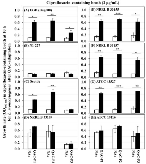 Changes in growth rate (OD600) for three QAC-adapted subpopulations (closed bars) in the ciprofloxacin-containing broth (2 µg/mL) at 10 h, as compared to the non-adapted control (NAc, open bars) of eight L. monocytogenes strains (A–H) at 37 °C. Error bars indicate the standard errors of means. Statistically significant p-values are indicated by the asterisks (* p < 0.05; ** p < 0.01; *** p < 0.001) that were obtained using the unpaired two-tailed t-test.