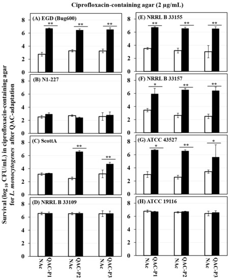 Changes in survival (log10 CFU/mL) for three QAC-adapted subpopulations (closed bars) in ciprofloxacin-containing agar (2 µg/mL) as compared to the non-adapted control (NAc, open bars) of eight L. monocytogenes strains (A–H). Error bars indicate the standard errors of means. Statistically significant p-values are indicated by asterisks (* p < 0.05; ** p < 0.01;) that were obtained using the unpaired two-tailed t-test.