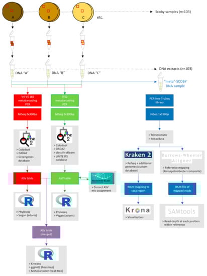 In order to generate global species-level information on the major taxa observed in commercially used Kombucha SCOBY cultures, a composite DNA ‘meta’-SCOBY was assessed with a shotgun sequencing approach. The same 103 samples included within the ‘meta’-SCOBY were also assayed individually using 16S and ITS metabarcoding, to facilitate analysis of taxa prevalence and clustering of samples according to their overall metabarcoding profiles (see analysis schematic in Figure 1).
