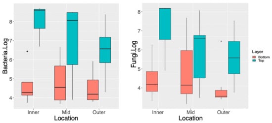 As shown in Figure 2, the top layer of this SCOBY was more enriched than the bottom layer for both fungi and bacteria, regardless of radial sampling position, with approximately 3-log more (3.55 × 107 CFU/g versus 3.02 × 104 CFU/g, respectively) bacteria and 2-log (3.55 × 107 CFU/g versus 3.02 × 104 CFU/g, respectively) more fungi. Two-way ANOVA reinforced this observation; radial position was not significantly different (bacteria p = 0.28, fungi p = 0.31), whereas layer was significantly different (bacteria p = 4.26 × 10−5, fungi p = 9.08 × 10−3, Table S5).