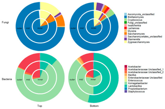 Spatial variation in the composition of fungal and bacterial communities within sectioned Kombucha SCOBY, derived by metabarcoding analysis. Percentages of normalized sequencing reads for each taxa are presented within concentric rings according to their spatial position (inner, mid, outer), with separate plots for top and bottom SCOBY layers.