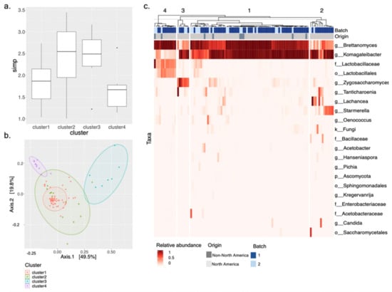 Looking more closely at diversity within the k-cluster designations, we observed alpha diversity (SI) to vary significantly by clusters but not by the number of taxa observed. Cluster III had the smallest number of observed taxa, 4.00 ± 0.58, followed, respectively, by Clusters I, II, and IV (Table S10). The number of observed taxa does not account for species richness or evenness of abundance, so the Simpson’s index was used to more accurately compare biodiversity among the clusters. Cluster I has significantly less biodiversity when compared to the other clusters (Figure 5a, Table S10). From the heatmap, we observe Cluster I to be dominated by Brettanomyces and Komagataeibacter (Figure 5c). The remaining clusters exhibit various combinations bacterial or fungal taxa in place of the diminished abundance of Brettanomyces or Komagataeibacter. Cluster II is comprised of Komagataeibacter with low to moderate abundance of Brettanomyces and elevated abundance of either Starmerella or Lachancea. Cluster III is also Komagataeibacter dominant, with low to moderate abundance of Brettanomyces and high abundance of Zygosaccharomyces. Lastly, Cluster IV is Brettanomyces-dominant with a low abundance of Komagateibacter and a high abundance of Lactobacillales.