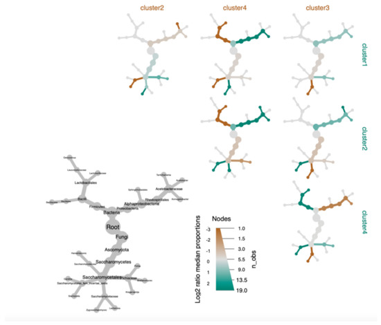 In order to more clearly visualize nuanced differences between clusters, a phylogenic heat tree matrix was constructed for taxa that significantly differed in relative abundance between clusters (p < 0.05) (Figure 6). As was observed in the heatmap, mean abundance of Komagataeibacter in Cluster I (n = 69, 66.9%) was higher than for Clusters III and IV. However, Komagataeibacter was lower in Cluster I than in Cluster II (n = 14, 13.6%). Starmerella appears to cooccur in Cluster II with a higher abundance of Komagataeibacter. Interestingly, when looking at the heatmap and heat tree together, we are able to observe that within cluster II, Tanticharoenia is the dominant bacterium when Starmerella is not as abundant. We potentially observe an antagonistic across-Kingdom dynamic between Starmerella and a specific genus of AAB.