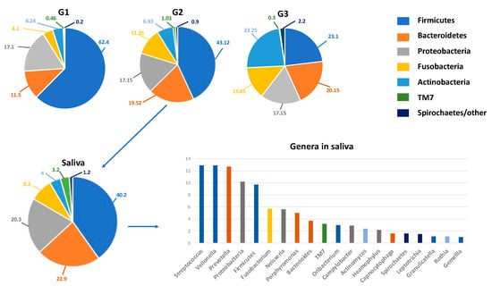 The oral microbiota of a healthy mouth. On top, the percentage composition of phyla in the various niches (G1–G3) of the oral microbiota. G1, Group 1: keratinized gingiva, hard palate and the buccal mucosa; G2, Group 2, tongue, tonsils, throat and saliva; G3, Group 3, sub- and supra-gingival plaque. On the bottom, details on the percentage composition of phyla (left) and genera mainly present in salivary microbiota (right). The genera are represented in descending percentages, and color bars reflect the phyla they belong to. The organisms inhabiting saliva account for 99.9% of all bacteria in the oral cavity and are usually planktonic organisms.