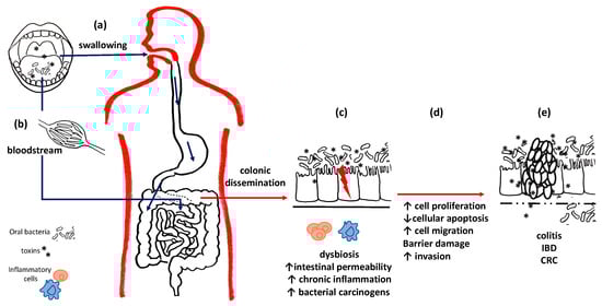 Oral bacteria and intestinal diseases. Oral bacteria can reach the intestines and stomach both through swallowing (a) and through the bloodstream (b). (c) At the level of the colon mucosa, they can compete with the local flora and establish intestinal dysbiosis. Pathogenic bacteria and their toxins alter the permeability of the basement membrane, perpetuate chronic inflammation and promote carcinogenesis. (d) Uncontrolled cell cycles reduced apoptotic efficiency and barrier damage results, thus leading to (e) chronic inflammatory diseases and the onset of cancers.