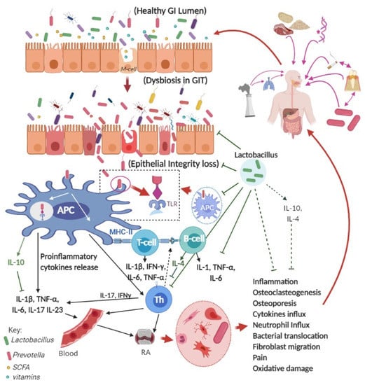 The gastrointestinal tract is connected with the environment, and it is an essential getaway for the intake of beneficial and harmful microbes and their metabolites through food and drinks. The human gut harbors over 100 trillion bacteria, and these microbes have a potential role in the digestion, metabolism, nutrition, disease control, and maintenance of general well-being [,,,]. The epithelial cell barrier and intestinal single cell layer determine the rate of entry of microbes or antigens into the bloodstream [,]. Disturbance in the gastrointestinal homeostasis, especially massive changes in gut microbiota composition, results in diarrhea, dysentery, or inflammatory responses such as RA [,,,]. Increased bacterial lipopolysaccharides in the bloodstream and their deposition in the synovial fluids can cause proinflammatory responses (by releasing cytokines) and RA [,] (Figure 1).