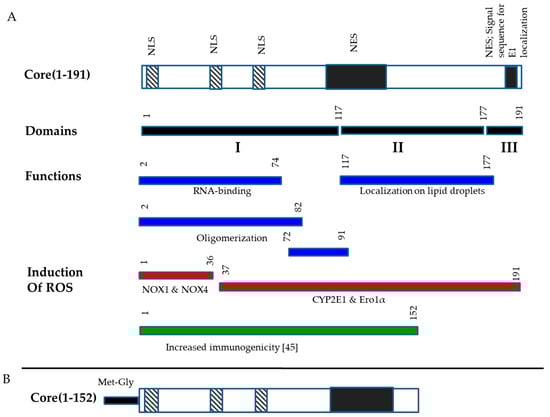 Structure of HCV core and its variant used for DNA immunization. Structural and structural domains of HCV core, domains responsible for RNA-binding, oligomerization, localization to lipid droplets, nuclear localization (NLS), nuclear export signals (NES), signal sequence for localization of E1 protein, induction of oxidative stress [] and release of immunosuppression in in vivo tests [] (A); Structure of HCV core aa 1-152 (Core152) encoded by expression optimized gene for the purpose of DNA immunization (B).
