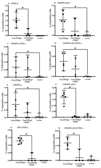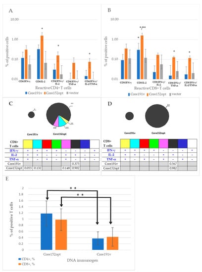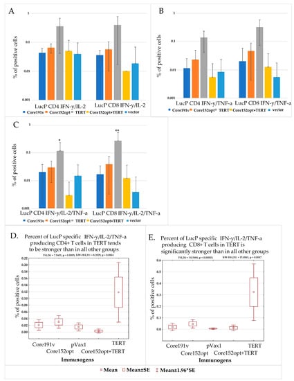 T cell response to immunodominant epitope at aa 166-168 of luciferase (LucP) in mice DNA immunized with Core191v, Core152opt, TERT, Core152opt/TERT mix or empty vector. Data from immunization series I and II; for vector mice, combined data from series I and II (Table 1). Percent CD4+ and CD8+ T cells secreting IFN-γ/IL-2 (A), IFN-γ/TNF-α (B), IFN-γ/IL-2/TNF-α (C); Statistical comparison of % IFN-γ/IL-2/TNF-α secreting CD4+ (D) and CD8+ T cells (E). Panels A-C, average ± STDV; D, E, mean ± standard error (ER). No difference between the groups in populations of IFN-γ/IL-2, and IFN-γ/TNF-α CD4+ and CD8+ in Kruskal Wallis test, and pairwise comparisons in Mann-Whitney U-test (A,B). ** p < 0.05, * p < 0.1, in pairwise comparison between mice DNA immunized with TERT versus other groups, Mann-Whitney U test (C) (Statistica Tibco, version 13.5).