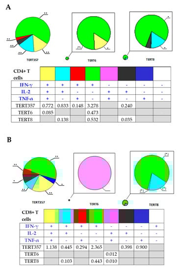 Structure of CD4+ and CD8+ T cell immune response against TERT induced by immunization with pVaxTERT plasmid. Average percent of CD4+ (A) and CD8+ (B) cells responding to stimulation with peptide pool TERT357, TERT6 and TERT8 (Supplementary Table S1) by production of one, two or three cytokines, visualizing exclusive populations. Tables beneath the graphs show actual percent of the respective populations, of total CD4+ (A) or CD8+ T cells (B). Populations in which TERT DNA immunized mice tend to differ from vector immunized mice are depicted in grey. Immunization details are described in Materials and Methods and groups, in Table 1. *—p < 0.05, **—p < 0.05 and (*)—p < 0.1 in comparison with vector immunized mice; grey filled empty boxes refer to absence of the respective T cell population (p > 0.1 compared to vector immunized mice). Statistical analysis in pairwise comparisons by Mann-Whitney U test (Statistica Tibco, version 13.5).