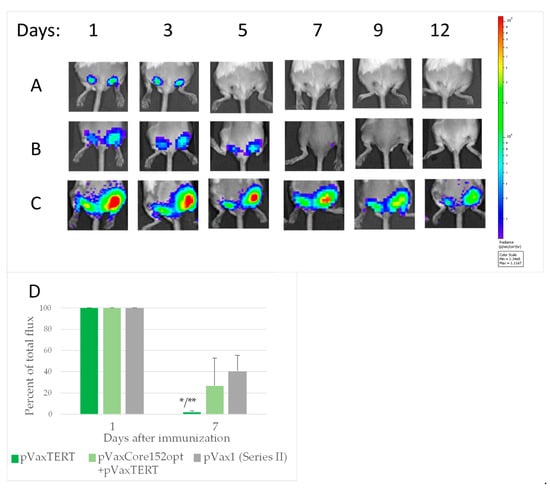 Loss of bioluminescence signal from the sites of booster DNA immunization with TERT, but not mixture TERT and core encoding plasmids. Mice immunized with plasmids encoding TERT (n = 5) (A), empty vector (n = 5) (B); mixture of plasmids encoding TERT and Core152opt (n = 5) (C), average percent loss from day 1 to day 7 (D). Images in panels A-C show individual mice followed in dynamics; figures on the top show days after DNA boost. Signal intensity in photons/sec is represented as a color scale to the right of the images. *—p < 0.05 as compared to vector immunized mice, ** p < 0.05, TERT versus Core152opt/TERT immunized mice, Mann-Whitney U test (Statistica Tibco, version 13.5).
