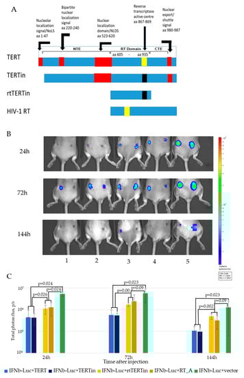 We pursued this further and assessed if expression of TERT could modulate the following step, i.e., the induction of innate immune response. To this end, we used the bioluminescence reporter system in which Luc is placed under the control of human IFN-β promoter (IFN-Beta_pGL3 []), widely used in in vitro assays [,,,]. We reasoned that it could also function upon introduction in vivo, if the test and reporter plasmids enter one and the same cell, as was perfectly demonstrated in assessment of the in vivo transcriptional activity of NF-β [,]. In the pilot experiments, we tested the effect on the IFN-β promoter of the control proteins first in vitro, and then in vivo. As a positive control, we chose the RNA-dependent RNA-polymerase of HCV (NS5B), shown to induce expression of RIG-1, resulting in activation of expression from IFN-β promoter, and as controls related to TERT, enzymatically active and inactivated reverse transcriptases of HIV-1 RThiv(a) and RThiv(in), respectively. In vitro, plasmids were delivered by co-transfection, and in vivo, by intradermal injections followed by electroporation. In vivo pilot experiments demonstrated that introduction of an additional (even non-coding) DNA interferes with the early expression of the reporter (24 to 48 h post delivery; Supplementary Figure S6A–C). Hence, in further experiments, as a control we used the reporter plasmid mixed with the empty vector. Pilot experiments demonstrated that the positive control, HCV NS5B, effectively induced expression of Luc reporter both in vitro, and in vivo (Supplementary Figure S7A,B), demonstrating functionality of the assay.