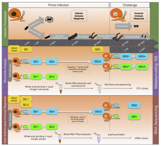 To decipher the inter-individual structure of snail microbiota as well as investigate the influence of different snail immune stimulations on its microbiota structure and dynamics, we applied a two-step experimental infection protocol (Figure 1).