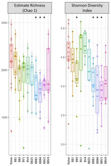 Microbiota alpha Diversity: Boxplots of Chao1 and Shannon indices for all samples. For the Naive condition, B0 and B25 snails were pooled; BB: primary infection of BgBRE by SmBRE; BV: primary infection of BgBRE by SmVEN; BBB: primary infection of BgBRE by SmBRE and secondary challenge by SmBRE; BBV: primary infection of BgBRE by SmBRE and secondary challenge by SmVEN. The time point is mentioned with 1, 4 or 25 corresponding to the day after primary infection or secondary challenge. The differences between naive and infected conditions were tested with a Mann–Whitney U test and significant differences mentioned with *.