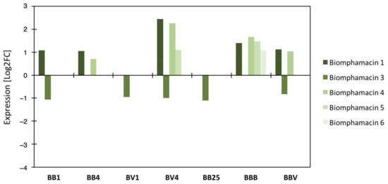 Differential gene expression of Biomphamacin antimicrobial peptides: Log2FC (fold change) of antimicrobial immune transcripts between naive and infected snails inferred from previous RNAseq analysis on the same experiment. A positive Log2 fold-change indicates over-expression in infected snails compared to the naive snails. Antimicrobial peptide families included 6 Biomphamacins (macin-like AMPs) consisting of 6 genes (shade of green).