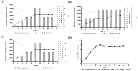 Bacterial growth, bacteriocin production and acidification of strains (A) E. faecium ST651ea, (B) E. faecium ST7119ea, (C) E. faecium ST7319ea and (D) corresponding bacterial cell count.