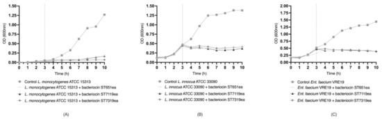 Bacterial growth inhibition of (A) L. innocua ATCC33090, (B) L. monocytogenes ATCC15313 and (C) E. faecium VRE19 by bacteriocins ST651ea, ST7119ea and ST7319ea.