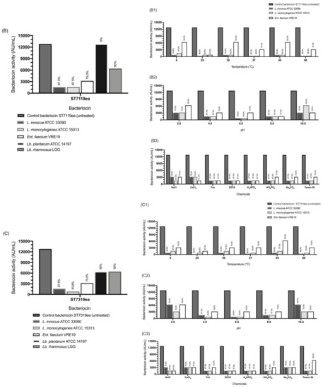 wherein AU/mLt0 and AU/mLt1 are the bacteriocin activity before and after treatment, respectively. Each set-up was conducted in at least two independent experiments.