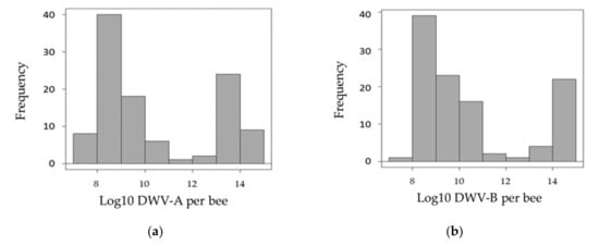 Overall frequency of DWV-A and DWV-B. The distribution of infections with DWV variants (Log10) is shown as the proportion of pupae with between 107 and 1015 DWV genome copies/nymph. (a) Histogram for DWV-A; (b) histogram for DWV-B.