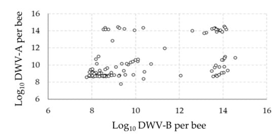 Relations between DWV variants. The relationships between the DWV variant (DWV-A and DWV-B) levels in the samples are represented by plotting the infection with both variants for each pupa.