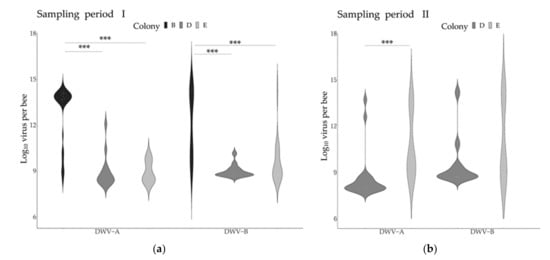 DWV variant genome copies across colonies and sampling periods. The graphs represent the levels of DWV-A and DWV-B across colonies and sampling periods. (a): Sampling period I (end of August to mid-September); (b): Sampling period II (October). The asterisks represent statistical significance after Bonferroni corrections (Period I: Kruskal–Wallis and Dunn tests; Period II: Wilcoxon–Mann–Whitney tests). Only groups with a sample size ≥ 14 were included (sample sizes: Period I: colony B: 33; Colony D: 14; Colony E: 22. Period II: Colony D: 18; Colony E: 18). Asterisks reflect significance levels.