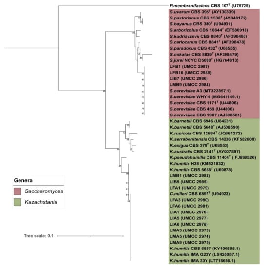 - Kurtzman, C.P.; Robnett, C.J. Identification and Phylogeny of Ascomycetous Yeasts from Analysis of Nuclear Large Subu.Pdf. Antonie Van Leeuwenhoek 1998, 98, 331–371. [Google Scholar] [CrossRef] [PubMed]