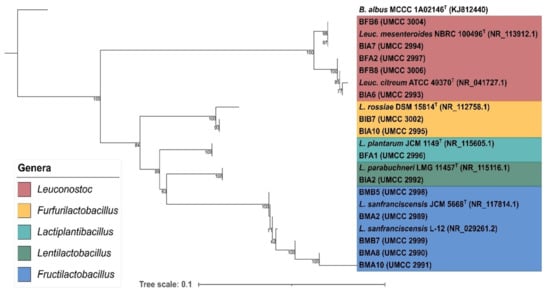 - Corsetti, A.; Settanni, L.; Van Sinderen, D.; Felis, G.E.; Dellaglio, F.; Gobbetti, M. Lactobacillus rossii sp. nov., isolated from Wheat Sourdough. Int. J. Syst. Evol. Microbiol. 2005, 55, 35–40. [Google Scholar] [CrossRef]