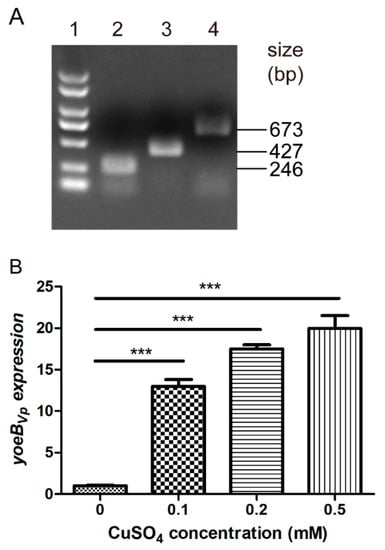 The SC19/pSET2-PcopA-yoeBVp strain was grown to an OD600 of 0.6–0.8 and divided into four aliquots of 1 mL, which were supplemented with deionized water or CuSO4 at final concentrations of 0.1 mM, 0.2 mM, or 0.5 mM. After 15 min of incubation, bacterial cells were collected and subjected to RNA extraction using an Eastep Super Total RNA Isolation Kit (Promega, Shanghai, China). RNA was evaluated for integrity by gel electrophoresis and determined for concentration using a Nanodrop 200.