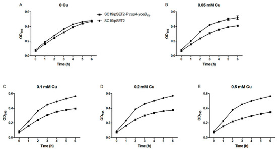 Overnight cultures of the SC19/pSET2-PcopA-yoeBVp and SC19/pSET2 strains were diluted in fresh medium and grown to an OD600 of approximately 0.3. Next, each culture was divided into five aliquots (1 mL per aliquot), to which CuSO4 was added at final concentrations of 0, 0.05, 0.1, 0.2, and 0.5 mM, respectively. Each aliquot was sub-packed in triplicate in 96-well plates (200 μL/well) and cultured at 37 °C for 6 h. The OD595 values were measured hourly using the CMax Plus plate reader (Molecular Devices, Shanghai, China).