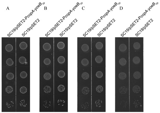 The SC19/pSET2-PcopA-yoeBVp and SC19/pSET2 strains were grown in fresh media containing various concentrations of CuSO4, and their growth curves were measured. As shown in Figure 2A, the two strains exhibited similar growth in the absence of CuSO4. However, when supplemented with CuSO4, the SC19/pSET2-PcopA-yoeBVp strain displayed a remarkable growth defect compared with the SC19/pSET2 strain (Figure 2B–D).