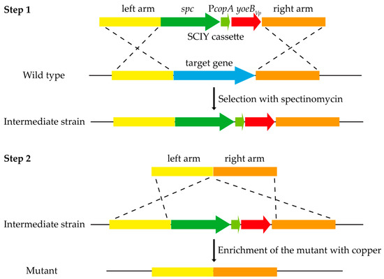The spectinomycin-resistance gene and PcopA-yoeBVp construct were combined to generate the SCIY cassette, which was further used for markerless gene deletion in S. suis. The strategy for markerless gene deletion in S. suis using the SCIY cassette is shown in Figure 4. In the first step, an intermediate strain was generated, in which the SCIY cassette replaced the target gene. As the SCIY cassette contains the spectinomycin-resistance gene, the intermediate strain could be selected with spectinomycin. In the second step, the markerless gene deletion mutant was generated. The intermediate strain contains the PcopA-yoeBVp construct; thus, its growth was inhibited in the presence of copper. However, the mutant could grow well in the presence of copper. After three to five dilutions in media supplemented with copper, the mutant was enriched to be easily isolated.