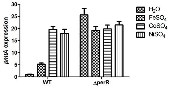 In a previous study, we demonstrated that the pmtA gene encodes a ferrous iron and cobalt efflux pump in S. suis; its expression was significantly induced by ferrous iron, cobalt, and nickel [32]. Upstream of the pmtA gene is a gene encoding the PerR regulator. RT-qPCR analysis was performed to determine whether the pmtA gene is under the control of PerR. As shown in Figure 6, pmtA expression in the WT strain was upregulated following treatment with ferrous iron, cobalt, and nickel. However, pmtA expression in the ΔperR mutant was upregulated without metal supplementation (Figure 6). The results reveal that deletion of perR led to derepression of the pmtA gene; thus, pmtA expression in ΔperR was upregulated without treatment with ferrous iron, cobalt, or nickel.