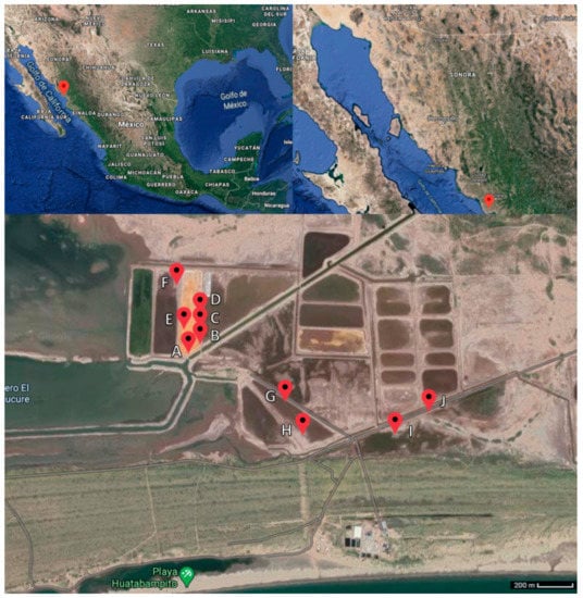 Maps of Huatabampo municipality in México, in the Sonora State, and of the Santa Bárbara saltern, showing the 10 sampling points (A: N26°42.421′W109°38.510′; B: N26°42.444′W109°38.475′; C: N26°42.469′W109°38.468′; D: N26°42.512′W109°38.469′; E: N26°42.498′W109°38.530′; F: N26°42.619′W109°38.554′; G: N26°42.269′W109°38.176′; H: N26°42.175′W109°38.119′; I: N26°42.167′W109°37.800′; J: N26°42.240′W109°37.677′). Satellite photo from Google maps.