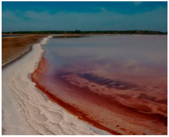 Santa Bárbara saltern (Figure 2) is a salt-producing area in a non-protected zone located in the Municipality of Huatabampo, Sonora, México, at 10 m above sea level. It belongs to the physiographic province of the pacific coastal plain. This region is a flat relief next to the ocean with flooded areas parallel to the coast covered by alluvial sediments from the Sierra Madre Occidental [32]. The weather is dry with an average temperature of 23.4 °C, ranging from 0 °C in winter to 49 °C in summer. The annual precipitation is less than 300 mm; the fauna is composed of a variety of endemic birds, reptiles, amphibians, felines and turtles; and the vegetation is mainly xerophytic and halophilic plants [33,34].