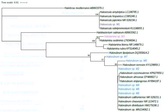 Maximum likelihood phylogenetic tree showing the relationship between the isolated strains and related taxa. Reconstruction was based on partial 16S rRNA sequences with the calculated T92+1 evolutionary model. Bootstrap values, indicated at nodes harboring the studied strains, were obtained from 1000 bootstrap replicates and are reported as percentages. Haloferax mediterranei was used as the outgroup. The closest reference strains are shown in black.