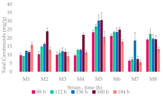 All strains were carotenoid producers; the highest carotenoid production started from 136–160 h, at the stationary phase. A graph of the yield of carotenoids per gram of biomass produced by each strain is found in Figure 5.