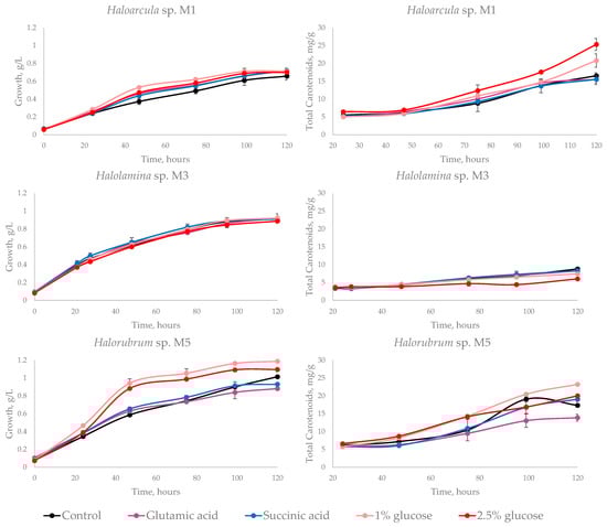 The most carotenoid-producing strain of each genus was selected for deeper investigation; in particular, the microbial response to carbon source presence was evaluated. For this purpose, three different carbon sources, namely, glucose (10 and 25 g/L), succinic acid (3.5 g/L) or glutamic acid (3 g/L), were added at a time to 40 mL of the culture medium ATTCC2185 at the optimal conditions of each isolate. After regular interval times, growth was monitored for 120 h by measuring the OD620 for biomass calculation according to the equation described above and by extracting the carotenoids as reported. Experiments were carried out in triplicate.