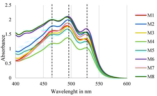 The eight strains were able to produce carotenoids as revealed from spectrophotometric investigation. The spectrophotometric scans showed the three characteristic peaks of bacterioruberin in acetone (λ468, 498 and 532 nm) according to Britton’s carotenoid manual [31], which confirms the presence of bacterioruberin as the main pigment in all of the strains. The scan is shown in Figure 7. Although bacterioruberin is the main pigment, there may be other carotenoids in which its spectrum is hidden behind that of bacterioruberin, as chromatographic characterization is necessary to detect all pigments.