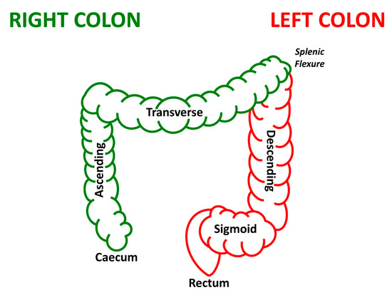 The term colorectal cancer encompasses a heterogeneous group of tumors of the lower gastrointestinal tract. Cancer location can be defined in relation to the colonic splenic flexure (Figure 1), with tumors of the caecum, ascending and transverse colon, termed right-sided colorectal cancer, and tumors of the descending colon, sigmoid colon, and the rectum, termed left-sided colorectal cancer [1,2]. The right and left colon have distinctive embryological origins, developing from the midgut and hindgut, respectively [3]. These two anatomical colonic locations are supplied by different blood supplies, with the right colon being supplied by the superior mesenteric artery and the left colon being supplied by the inferior mesenteric artery [3,4].