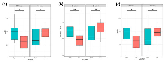 On- and off-tumor alpha diversity between right and left colon. Alpha diversity metrics (a) Abundance-based coverage estimate (ACE), (b) Observed operational taxonomic units (OTUs), and (c) Chao1 were significantly greater in the right compared to the left off-tumor microbiota. On-tumor alpha diversity metrics showed no significant differences between tumor locations. (* p ≤ 0.05, ** p ≤ 0.01, ns p > 0.05).